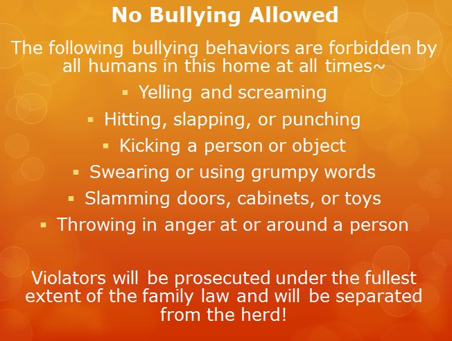 In place of a lengthy list of rules, we do wider based principles. Our major, untouchable, immovable family rule, is “No Bullying!” This was set up way before bullying became such an epidemic in our schools and since it is our most important family principle, we have kept the line the same. Bullying, in our family, incorporates a gambit of critical no’s. Here is a sign I have had made for this. Keep in mind our family adopts and fosters so we carry rules that will allow persons from abusive backgrounds to feel comfortable.