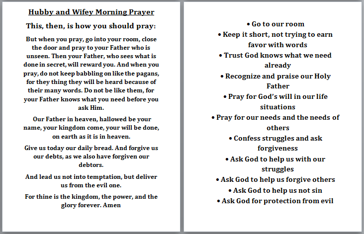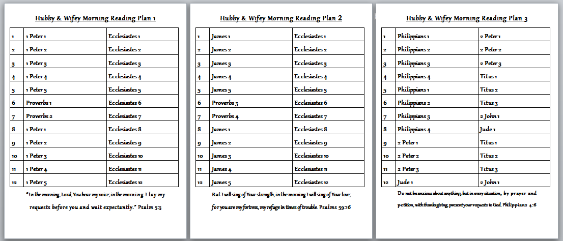 Feel free to print out a copy for your own use or to use as a guide to create your own. A full copy can be downloaded here. Hubby Wifey Morning Spiritual Plan